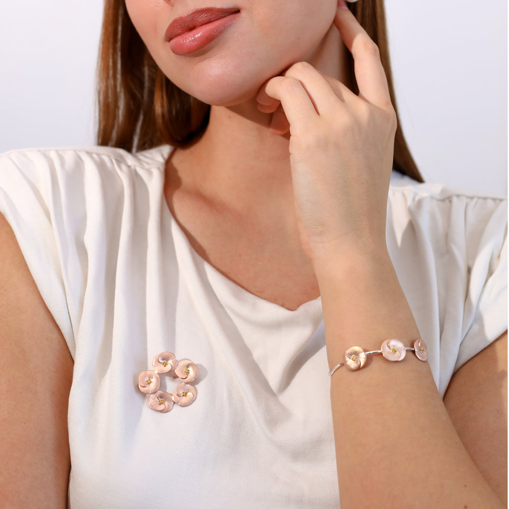 Çiçek figürü detaylarında, gümüş yüzeye doğal bir matlık kazandırılmış ve rose kaplama uygulanmıştır.
