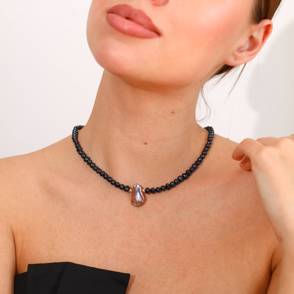 "Nocturne", siyah incilerin dizilimi, ortasında yer alan pembe tonlarındaki barok inciyle güçlü bir kontrast yaratıyor. Bu detay, hem dramatik hem de yumuşak bir ifade sunarak parçaya benzersiz bir karakter kazandırıyor. Minimalist ve şık tasarımıyla Nocturne, geceye dair duyguları stilinizde yansıtmak isteyenler için ideal bir seçim.